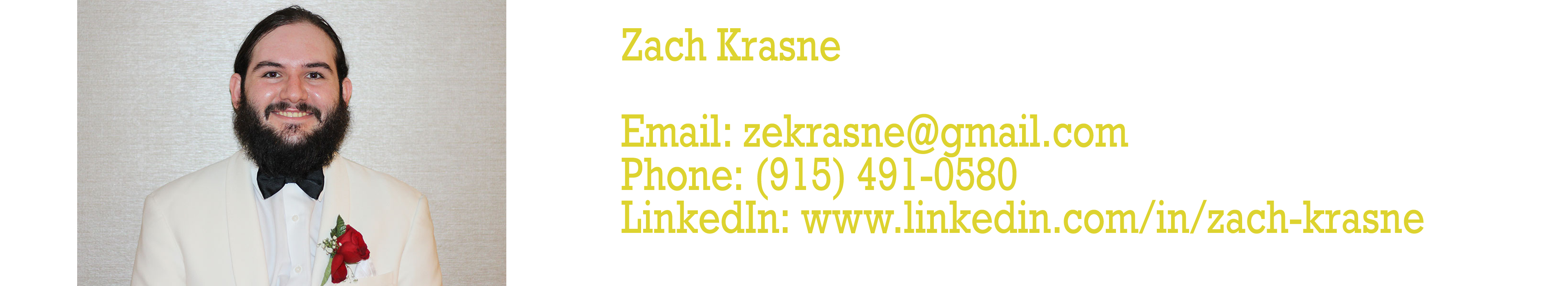 Hello! My name is Zach Krasne, and I am a recent graduate of the Computing in the Arts Program at the College of Charleston! I was born and raised in El Paso, Texas, but decided to go to college at the College of Charleston in South Carolina due to their Computing in the Arts program. This program, combining coding with computer graphics, merged my two passions into a singular college degree. Throughout my classes, I learned about many topics I didn't know much about before, including web design, game development, graphic design and user interface design all while learning several coding languages. I was able to take the knowledge from that course and use it for several projects, including this website which I made entirely from scratch using the skills I gathered in college!